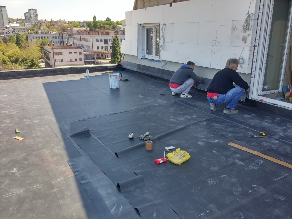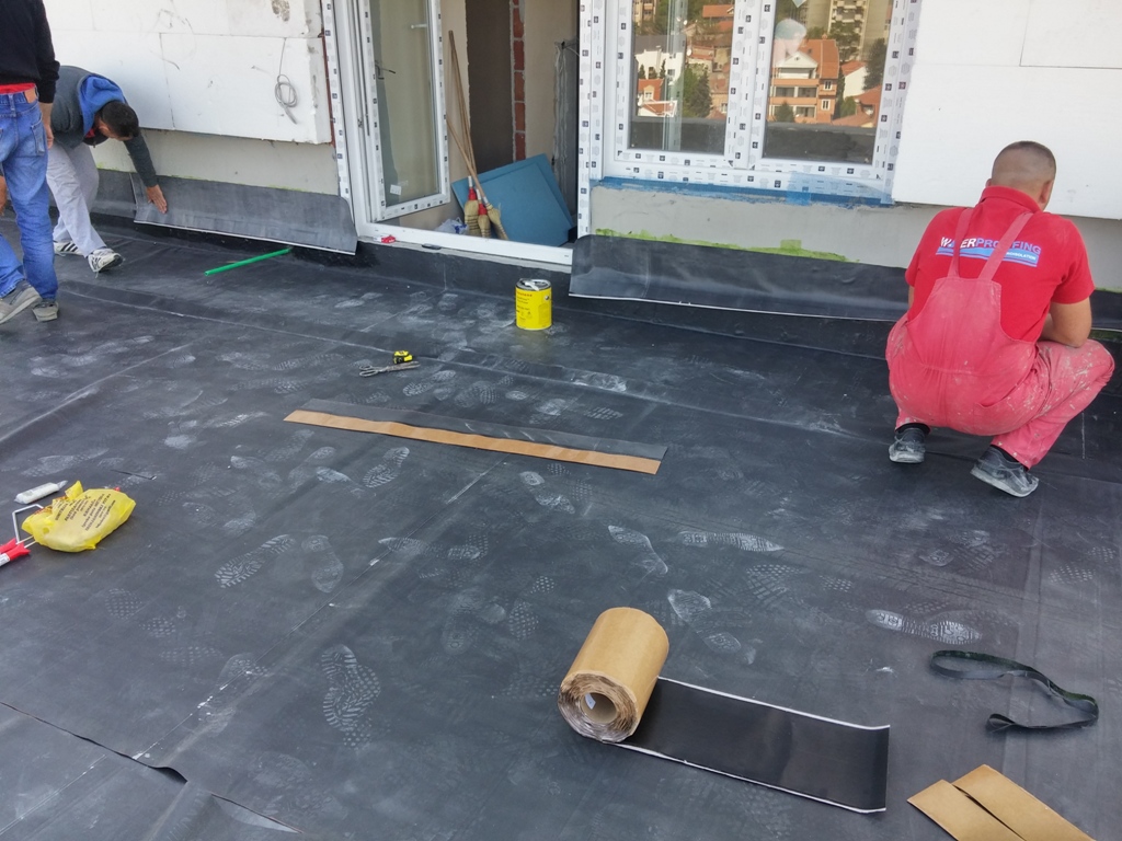 On Thursday, 13.04.2017 is set waterproofing EPDM membrane on the open terrace. On the terraces is set vapor barrier Sika Sarnavap 5000, insulation, layer pad with topping penetrate and EPDM membrane.