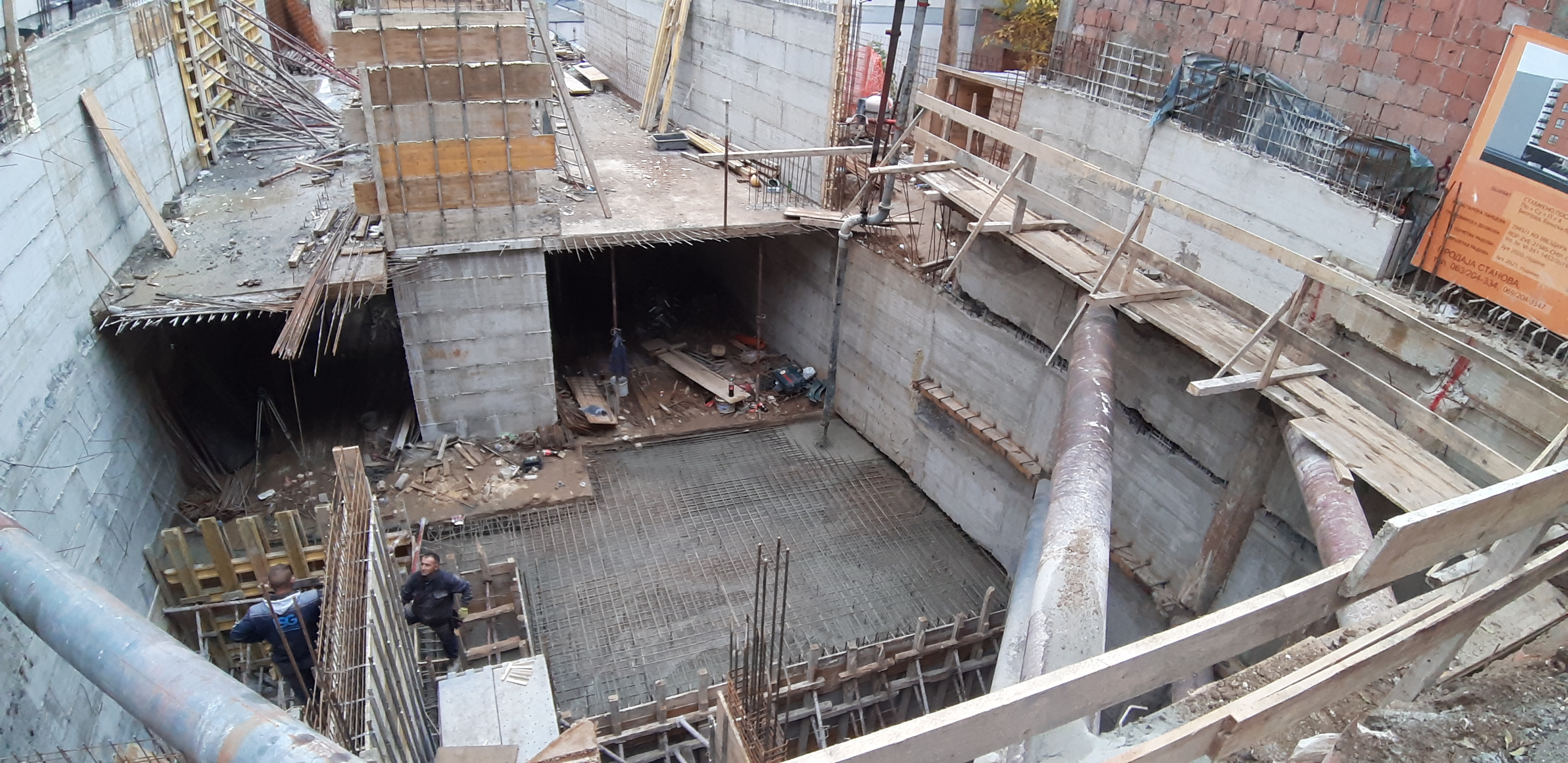 Betoniranje poslednjeg dela temeljne ploče, podrumskih zidova i stuba.